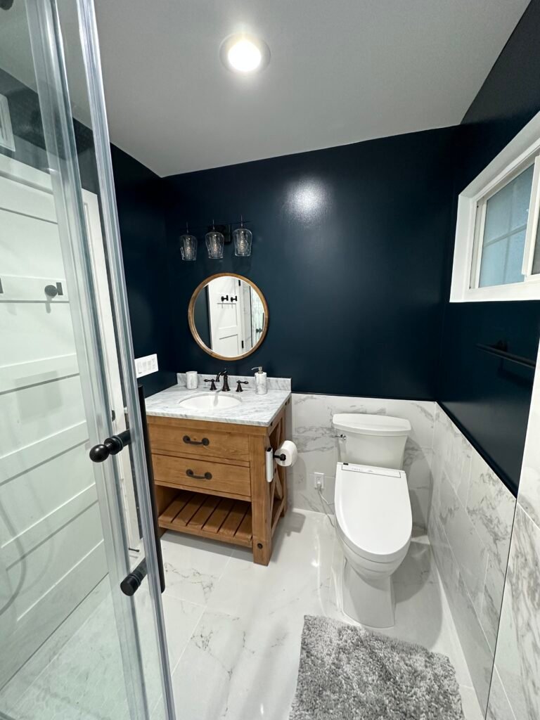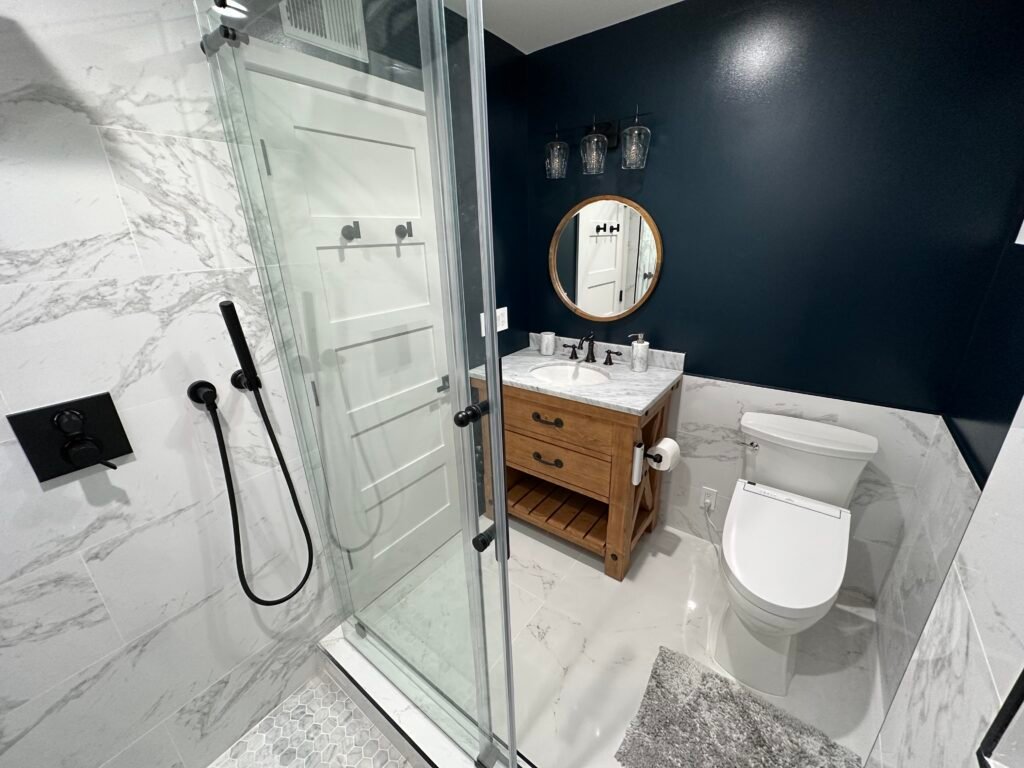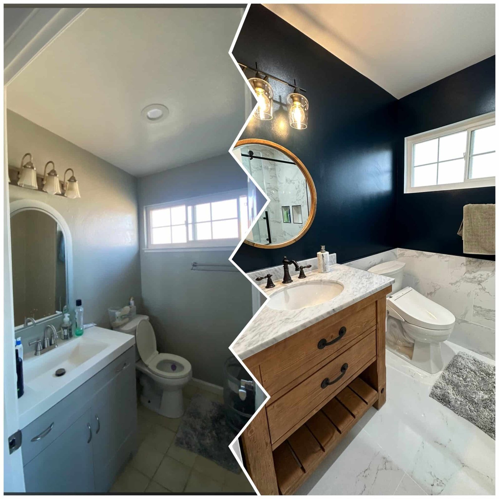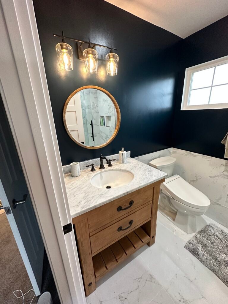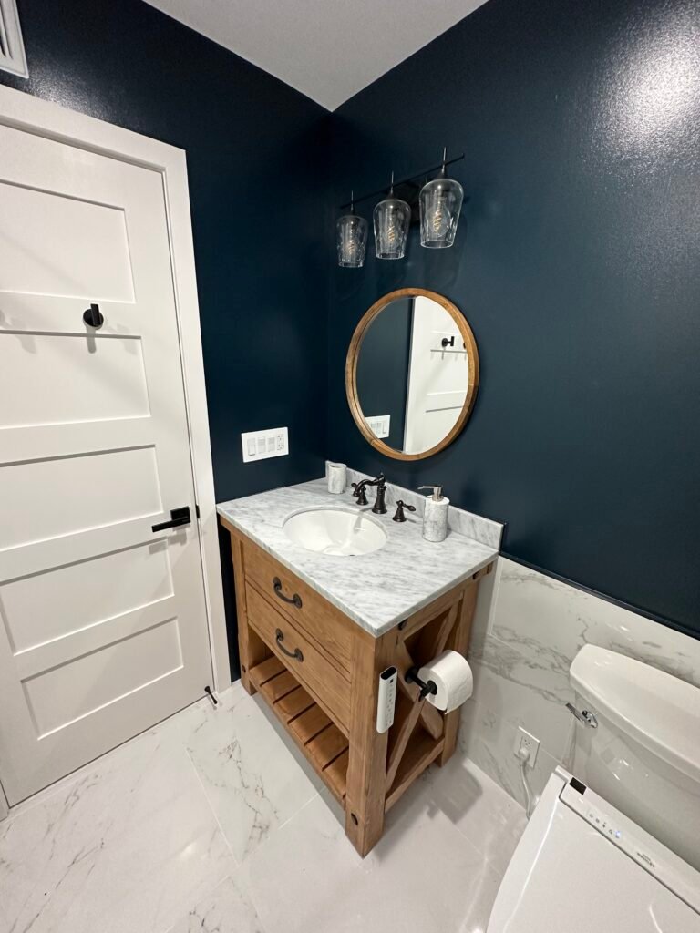 The new space showcases deep navy accent walls paired with sleek marble-look tile flooring and wall finishes for a sophisticated contrast. A custom wood vanity with a marble countertop adds warmth and texture, while a round mirror and modern light fixtures create a focal point full of personality. Updated plumbing fixtures and thoughtful design choices not only elevate the look but also improve functionality and storage.