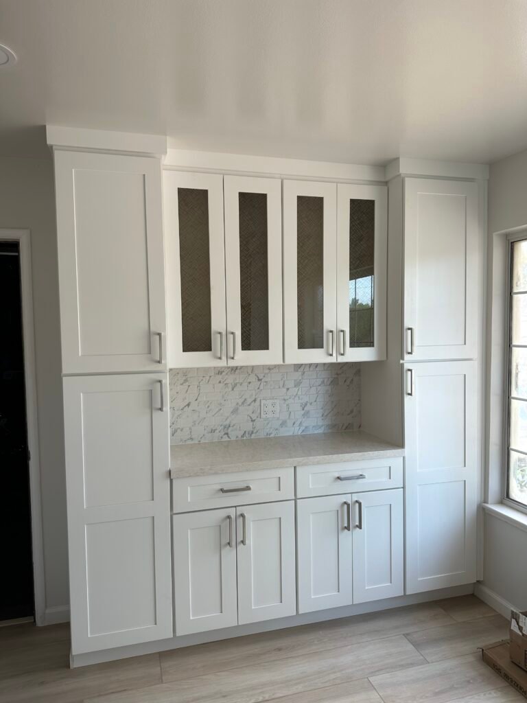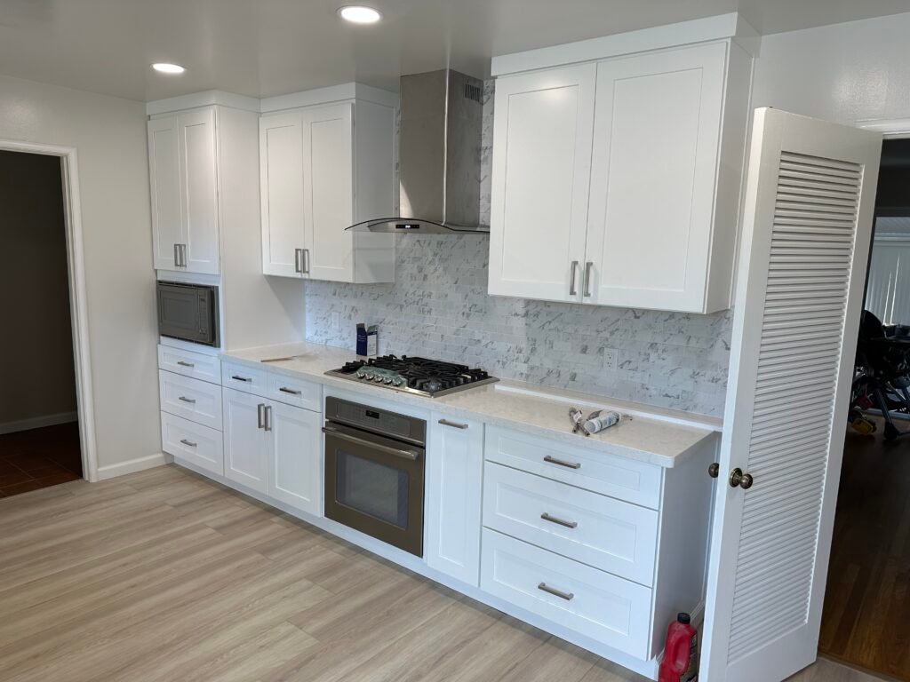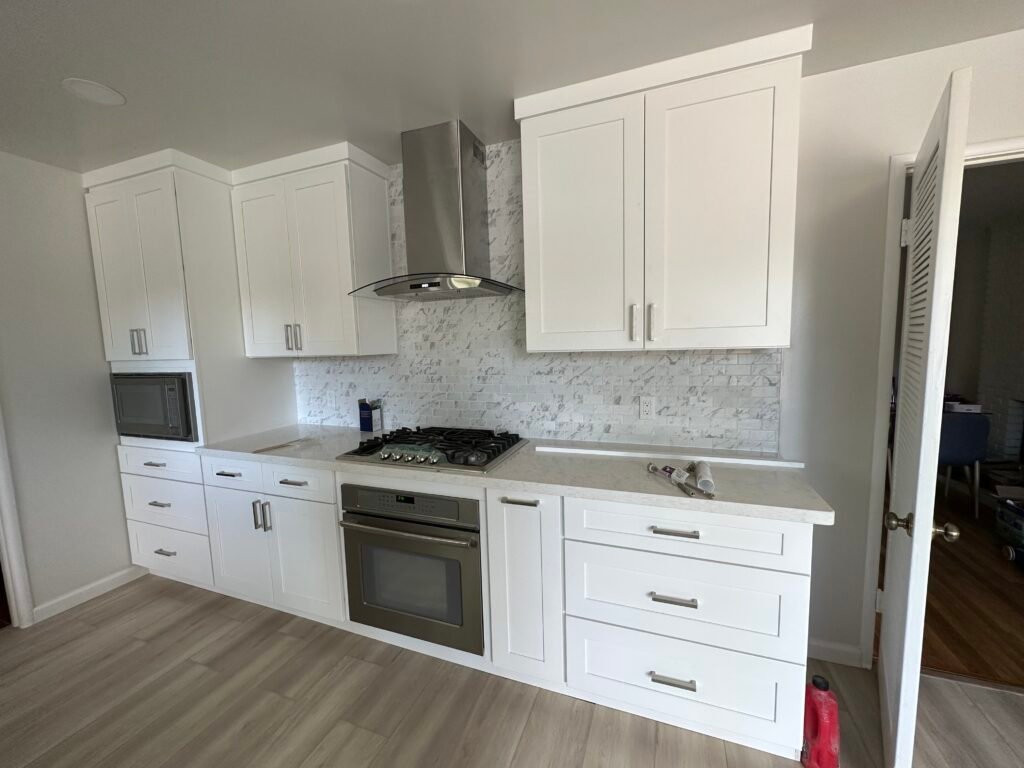 This kitchen was redesigned with simplicity, efficiency, and modern style in mind. Cotfort installed crisp white shaker cabinets that bring a timeless look while offering ample storage. The quartz countertops pair beautifully with a subtle marble-look backsplash, creating a bright and seamless aesthetic. A stainless-steel oven and range hood were added as focal points, combining sleek design with everyday functionality. Built-in space for the microwave keeps the counters clear, while soft-close drawers and cabinets enhance convenience. Light-toned flooring ties the entire design together, making the space feel open, airy, and inviting.