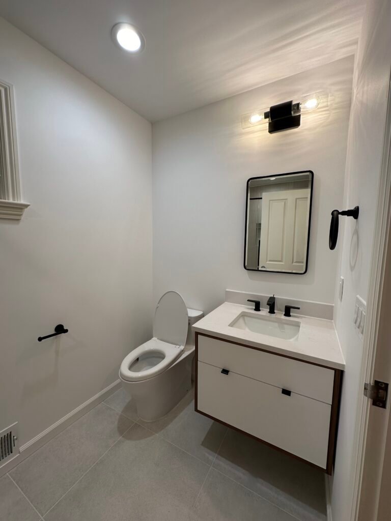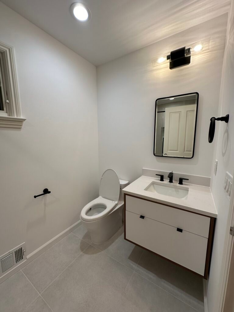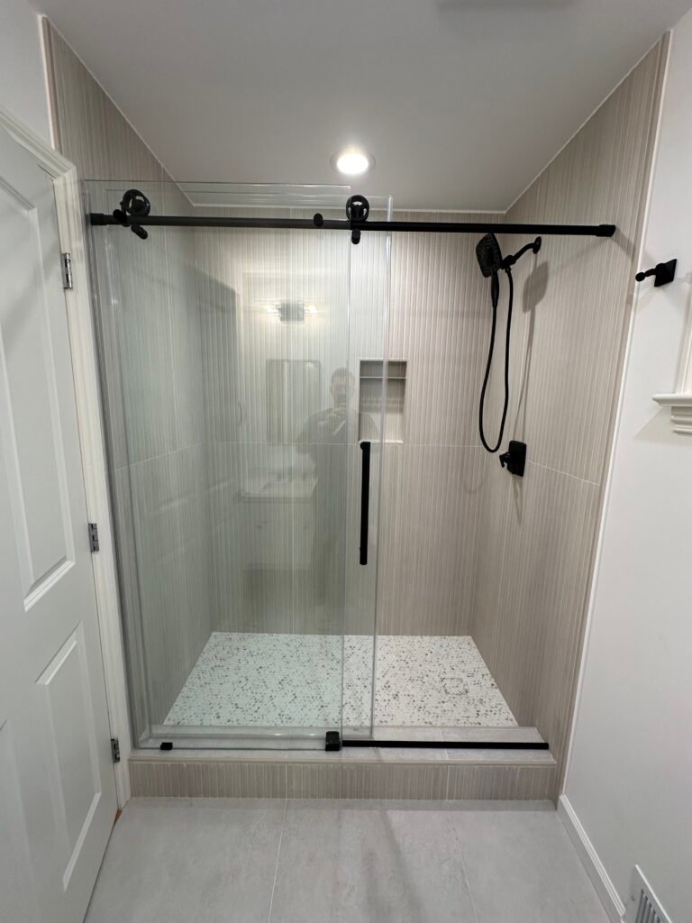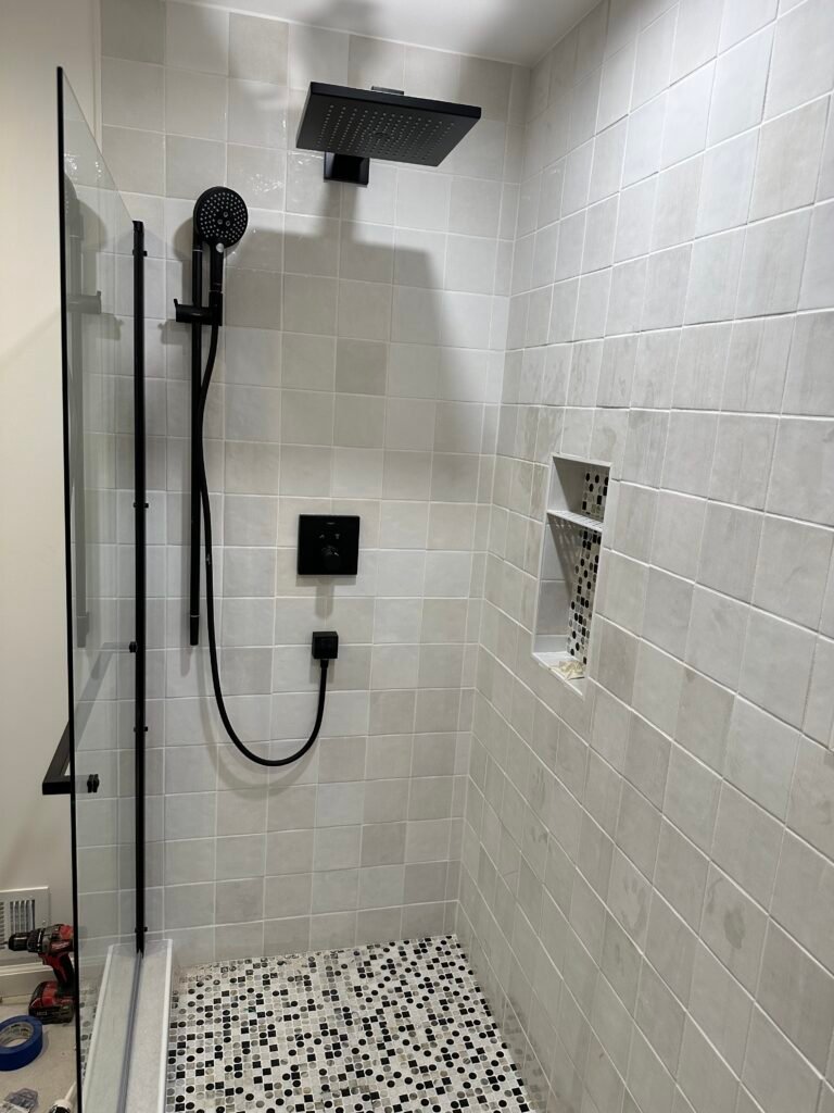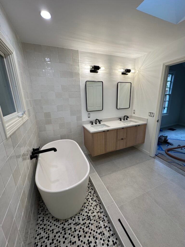 For this project, we transformed an outdated bathroom into a sleek, spa-like retreat that balances functionality with style. The remodel features a spacious walk-in shower with a rainfall showerhead, built-in niche with accent tile, and frameless glass enclosure. A freestanding soaking tub adds a luxurious centerpiece, perfect for relaxation.